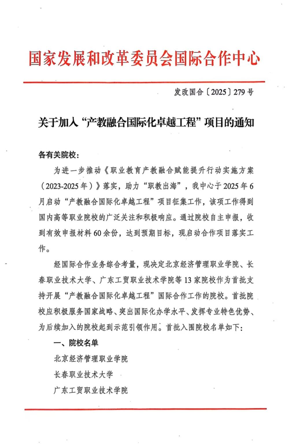 近日,国家发展和改革委员会国际合作中心公布“产教融合国际化卓越工程”首批入选院校名单,长春职业技术大学凭借雄厚的办学实力、卓越的国际化成果与系统的项目规划,成功从全国60余所申报学校中脱颖而出,跻身全国13...